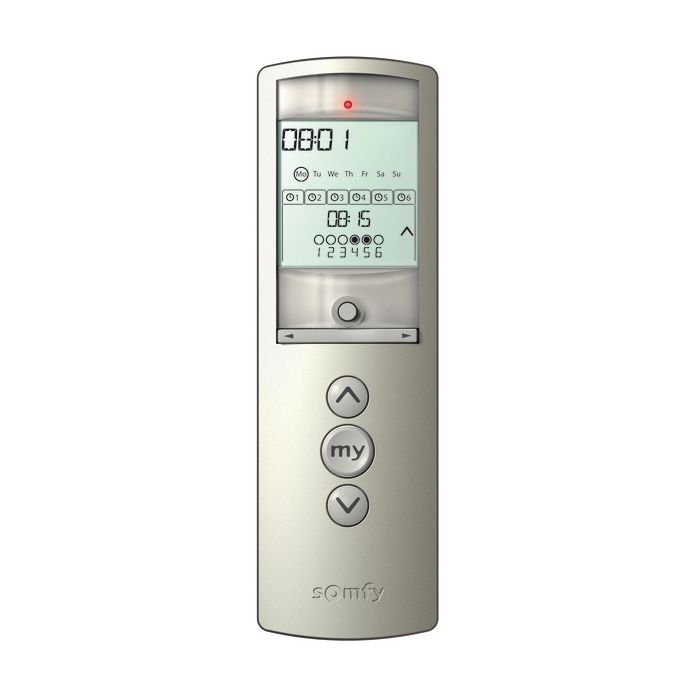 Der moderne Telis 6 Chronis RTS Handsender in der Farbe Silver, ist eine Zeitschaltuhr zur automatischen (zeitabhängig) und manuellen Steuerung mehrerer RTS-Funkmotoren/-Funkempfänger für bis zu 6 Kanäle.